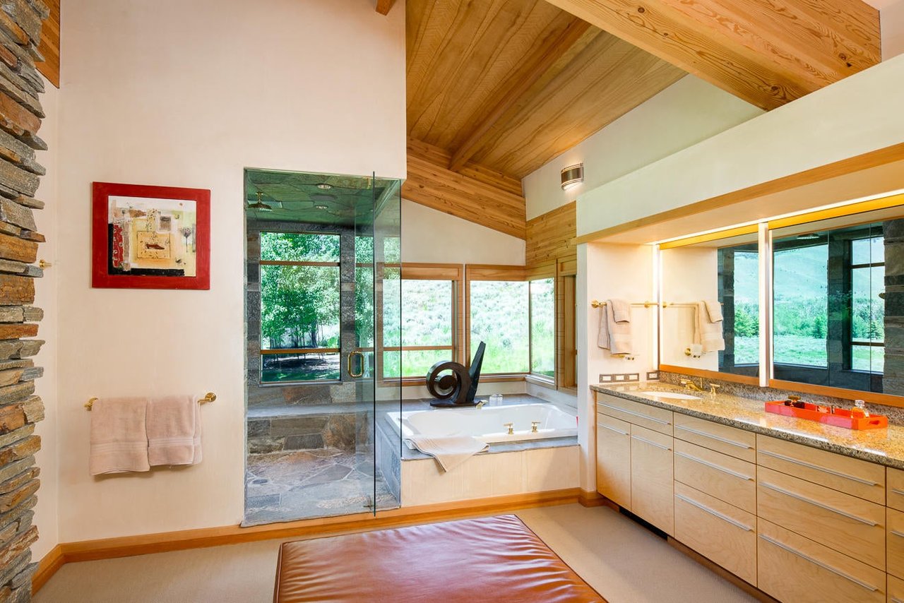 Architectural excellence in Gimlet Terrace blends high quality craftmanship with natural surroundings to create this timeless warm mountain contemporary. Designed by Mark Pynn with spectacular views in a private 14+ acres setting, the home features high ceilings, laminated beams supported by native stone, flagstone terraces, gracious indoor/outdoor entertaining spaces, all in exquisite detail.
